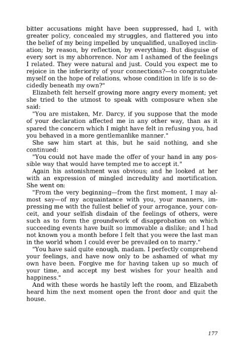 Darcys language here is quite different from his haughty proposal in chapter 34 wouldnt you say. That the wish of giving happiness to you might add force to the other inducements which led me on i shall not attempt to deny. Much as i respect them i believe i thought only of you. I have every reason in the world to think ill of you.